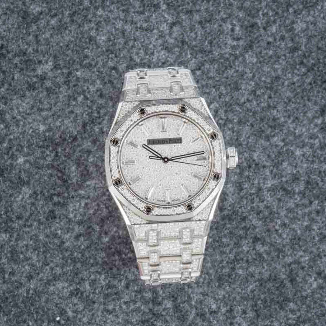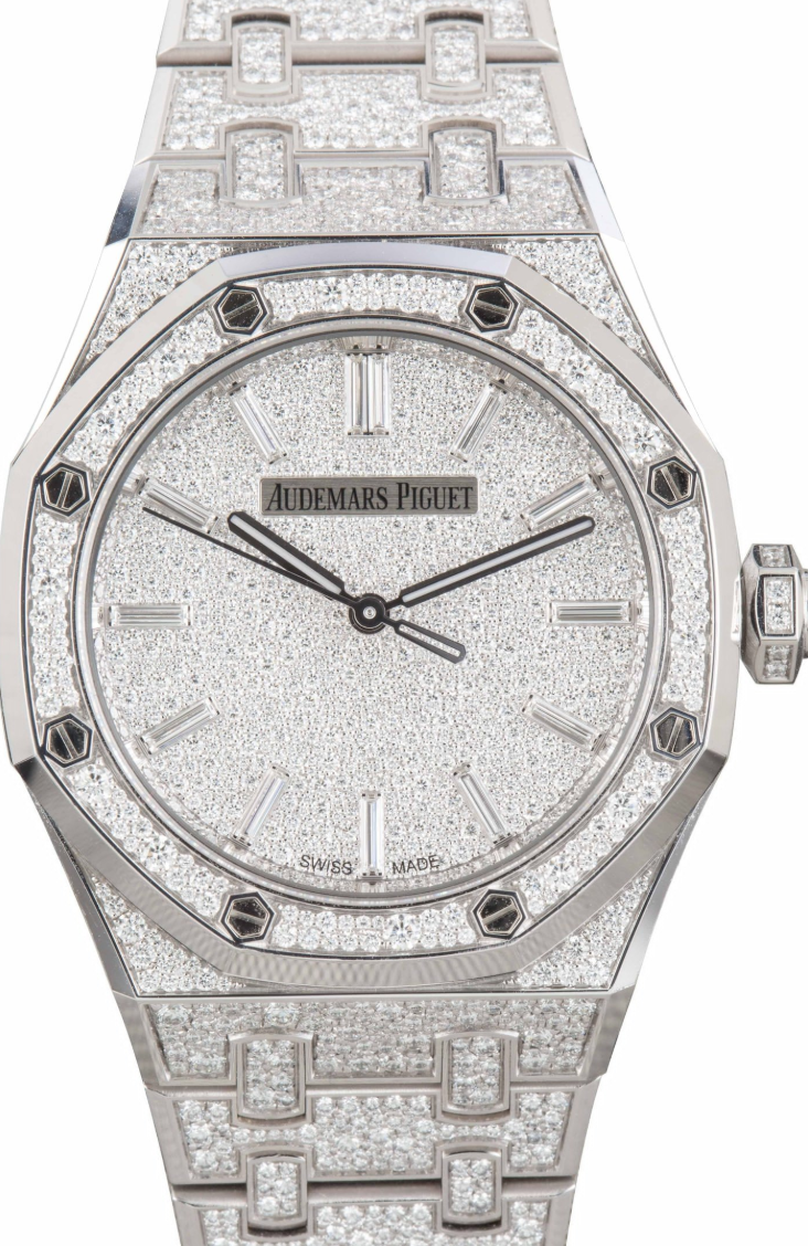 Pre-Owned Audemars Piguet Royal Oak Self-Winding ref 15552BC.ZZ.1358BC.01 dazzled collectors when it came to market in 2023, featuring a lustrous white gold finish and a completely iced-out aesthetic, also called “snow-set” by the brand. This technique is common among haute horlogerie and features hundreds of differently sized diamonds throughout, creating a dynamic, snow-like look that shimmers as the wrist moves. Visually intriguing and ultra-exclusive, this AP is the watch to wear if you want to turn heads. 13 baguette-cut diamonds serve as the hour markers, set against a white gold and diamond-encrusted dial. The rest of the watch is dripping in stones, including the faceted crown, iconic screw-set bezel, and integrated bracelet. In total, 318 diamonds adorn the case, 699 brilliant-cut and 13 banquette-cut diamonds adorn the dial, and 1,106 diamonds adorn the bracelet. That’s over 7 carats worth of diamonds. At the same time, the case is quite approachable at 37mm, balancing out the diamond-set design.