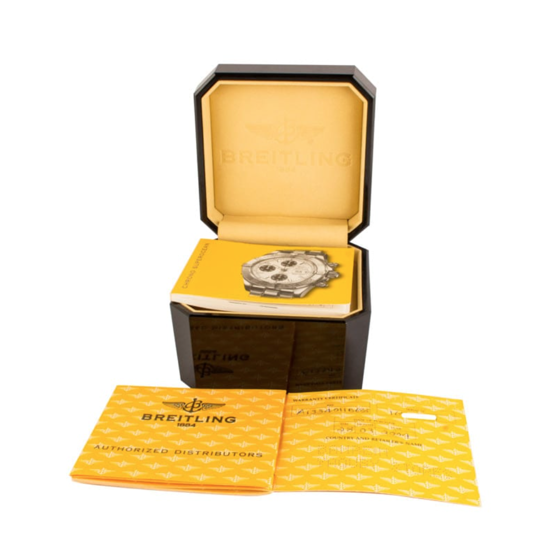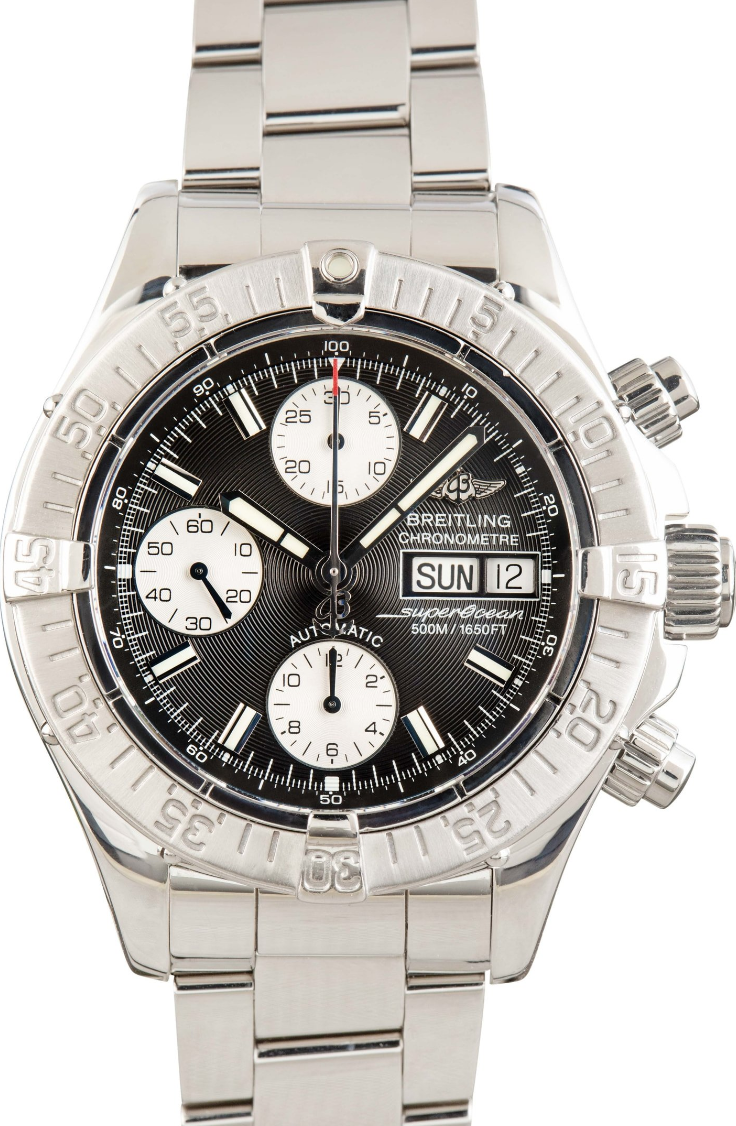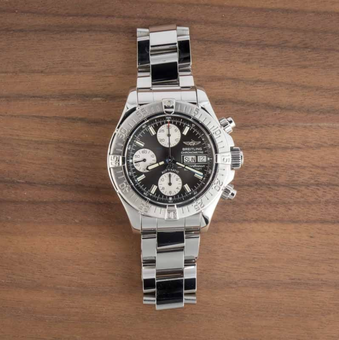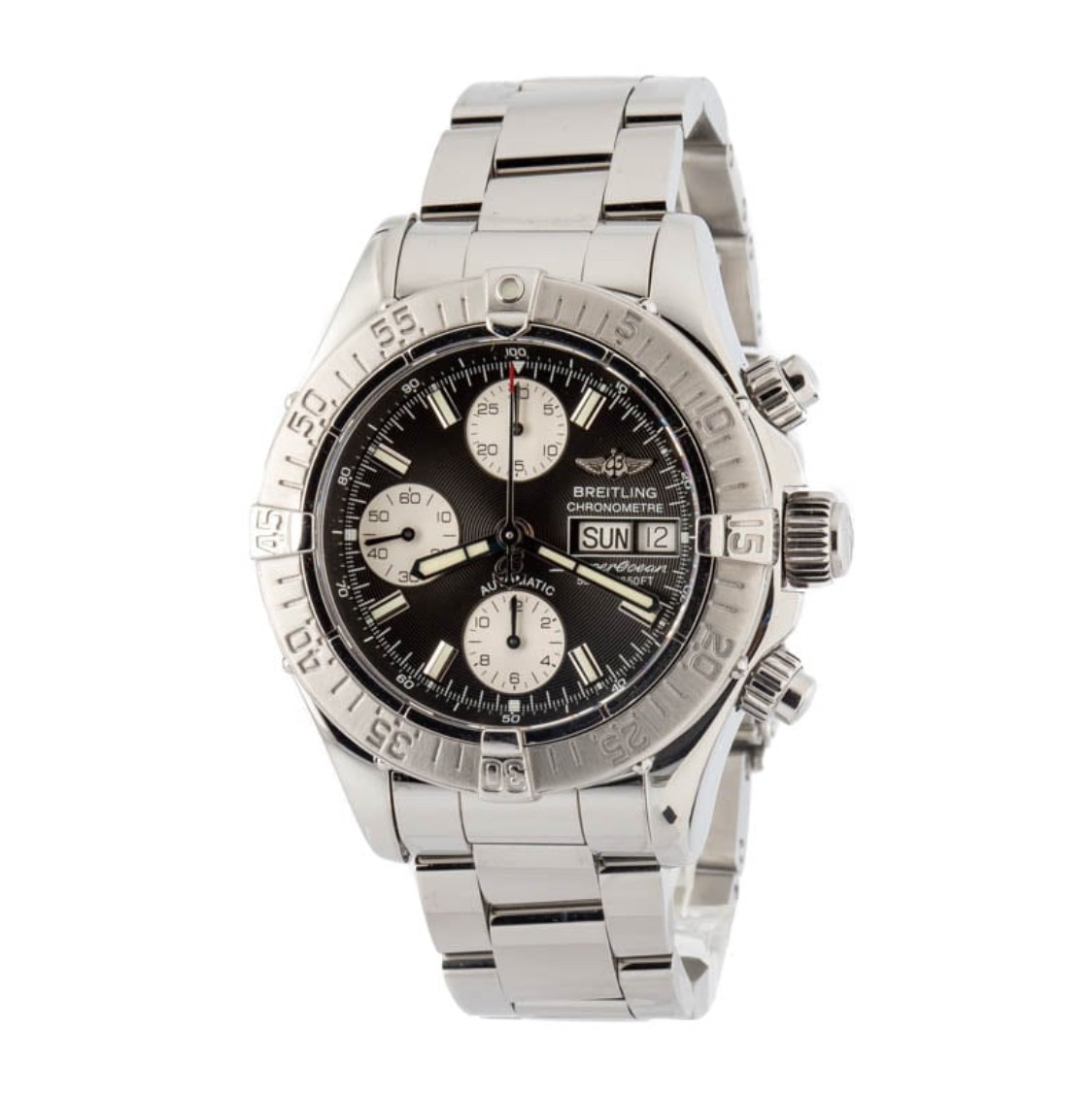 Pre-owned Breitling Superocean Chronograph ref A1334011/B683 (2004) combines two of the brand’s areas of expertise into one incredible watch: chronographs and diving watches. It sports the pushers above and below the crown and traditional tri-compax dial, which we’re used to seeing on a typical chronograph timepiece, while offering water resistance up to 500 meters/1,650 feet and a uni-directional diver’s bezel. It’s robust, purpose-driven, and contemporary – perfect for the collector with a sharp eye for high style. The dial sports a striking snailed texture, thoughtful placement of the luminescent material, and large, highly visible day and date windows at 3 o’clock.