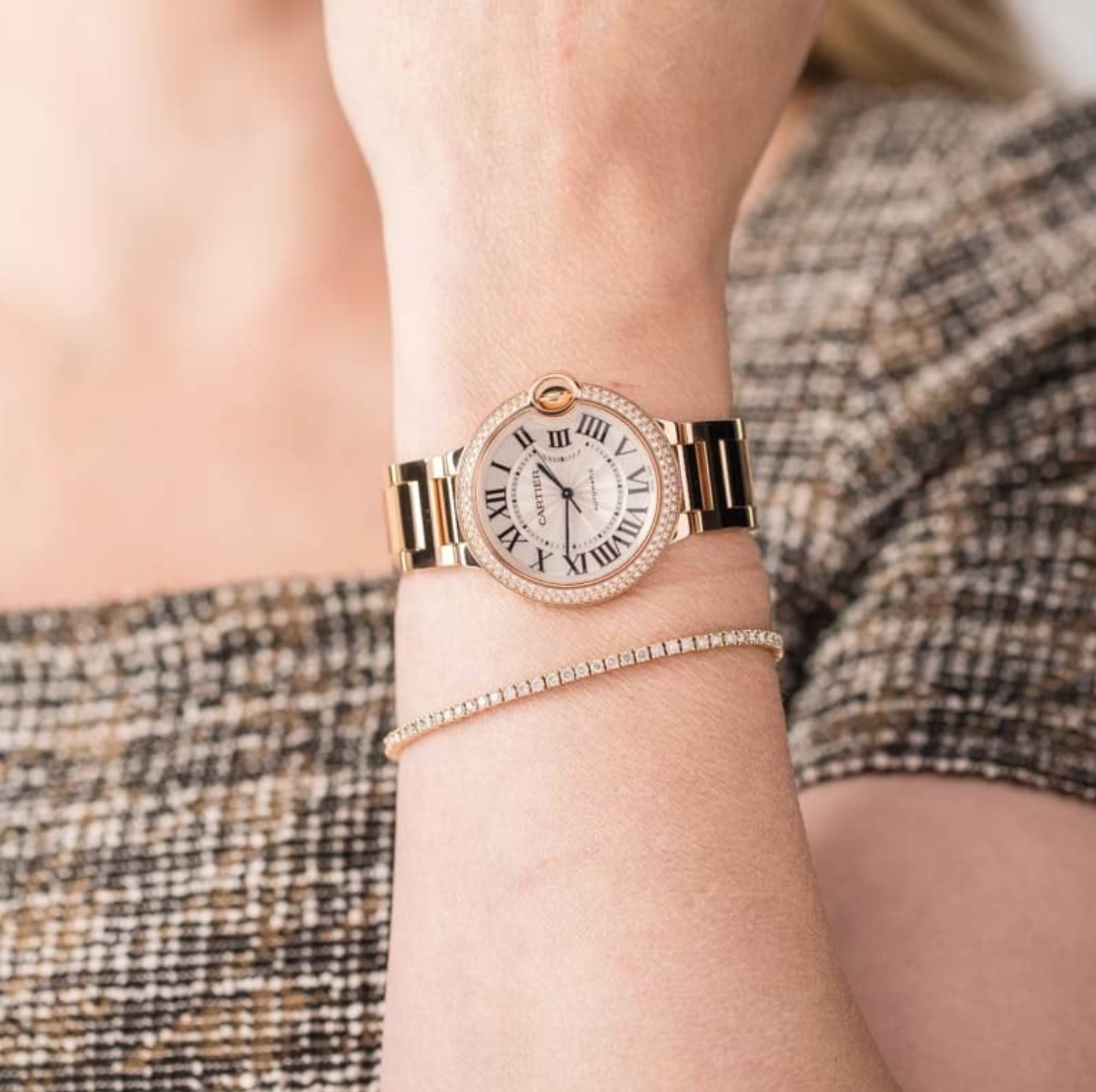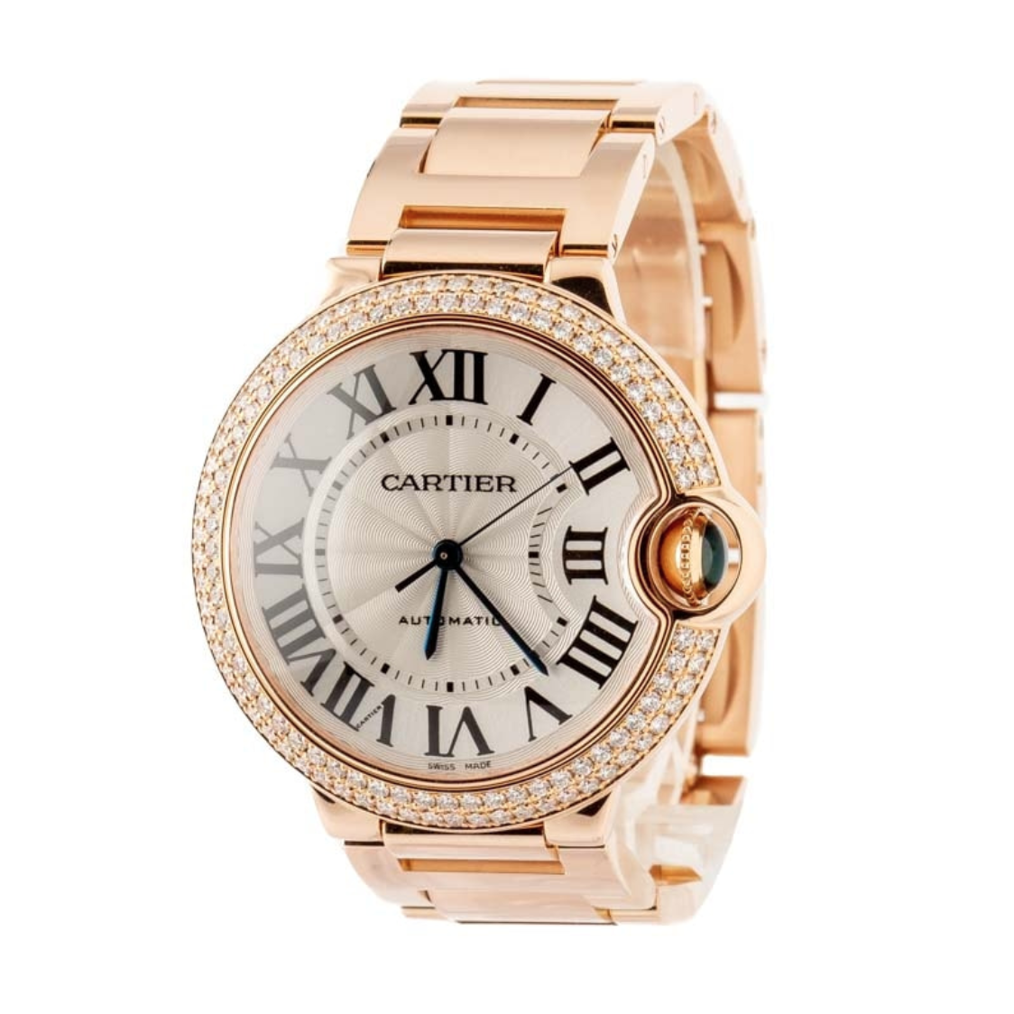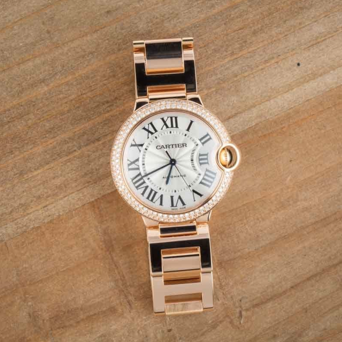 Pre-owned Cartier Ballon Bleu de Cartier ref WE9005Z3 (2009) is a truly dazzling take on one of the Maison’s most iconic modern designs. Introduced in 2007, the Ballon Bleu de Cartier re-imagines the classic round watch with a distinctive case and a unique integrated crown guard that curves into the silhouette, giving the watch its signature “floating balloon” effect. This particular model elevates the collection’s elegant profile with a luxurious rose gold finish and a stunning double diamond bezel that sparkles as the wrist moves. In true Cartier fashion, the silvered guilloché dial is adorned with Roman numerals and blued steel hands, capturing the brand’s timeless design codes.