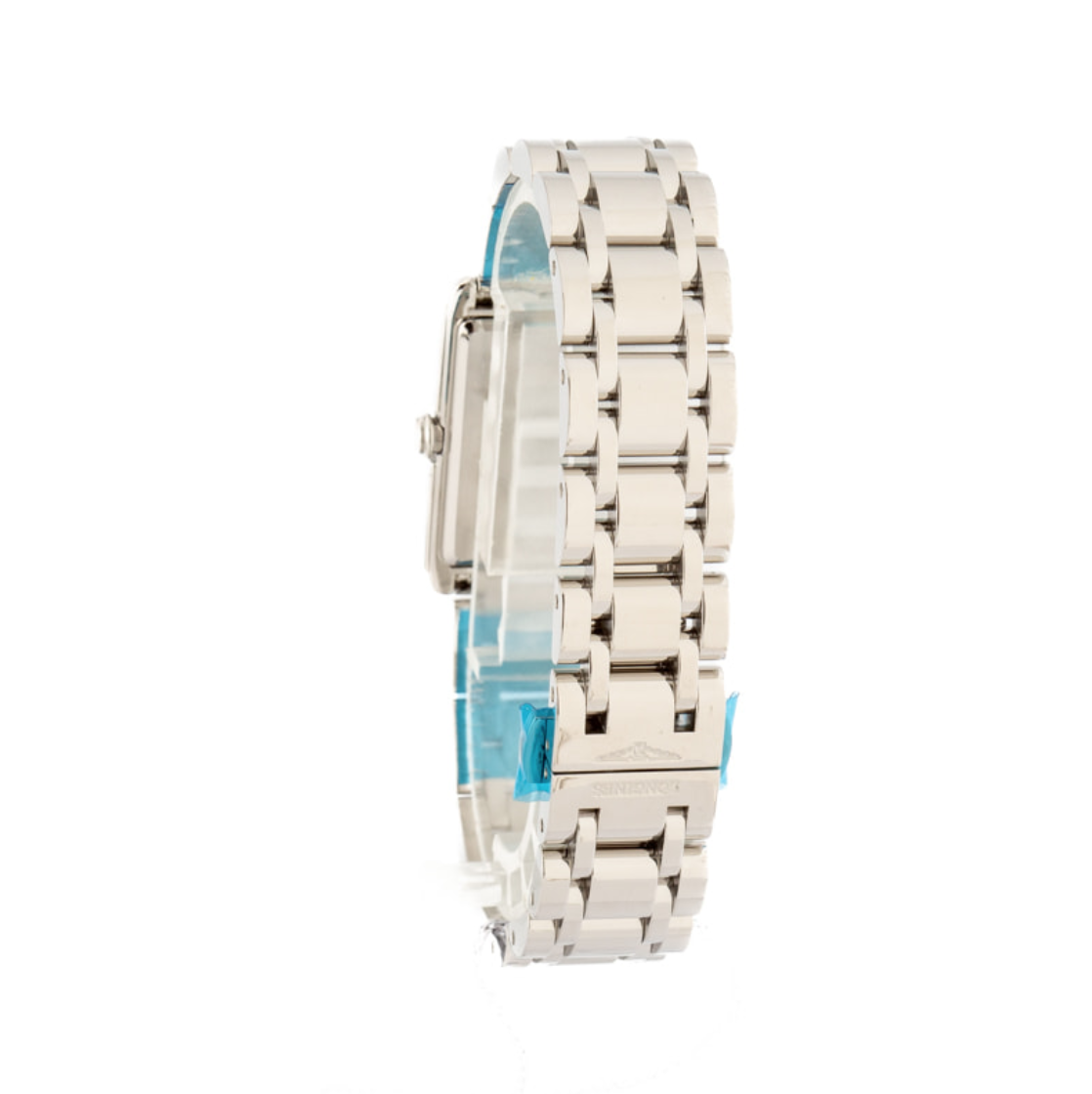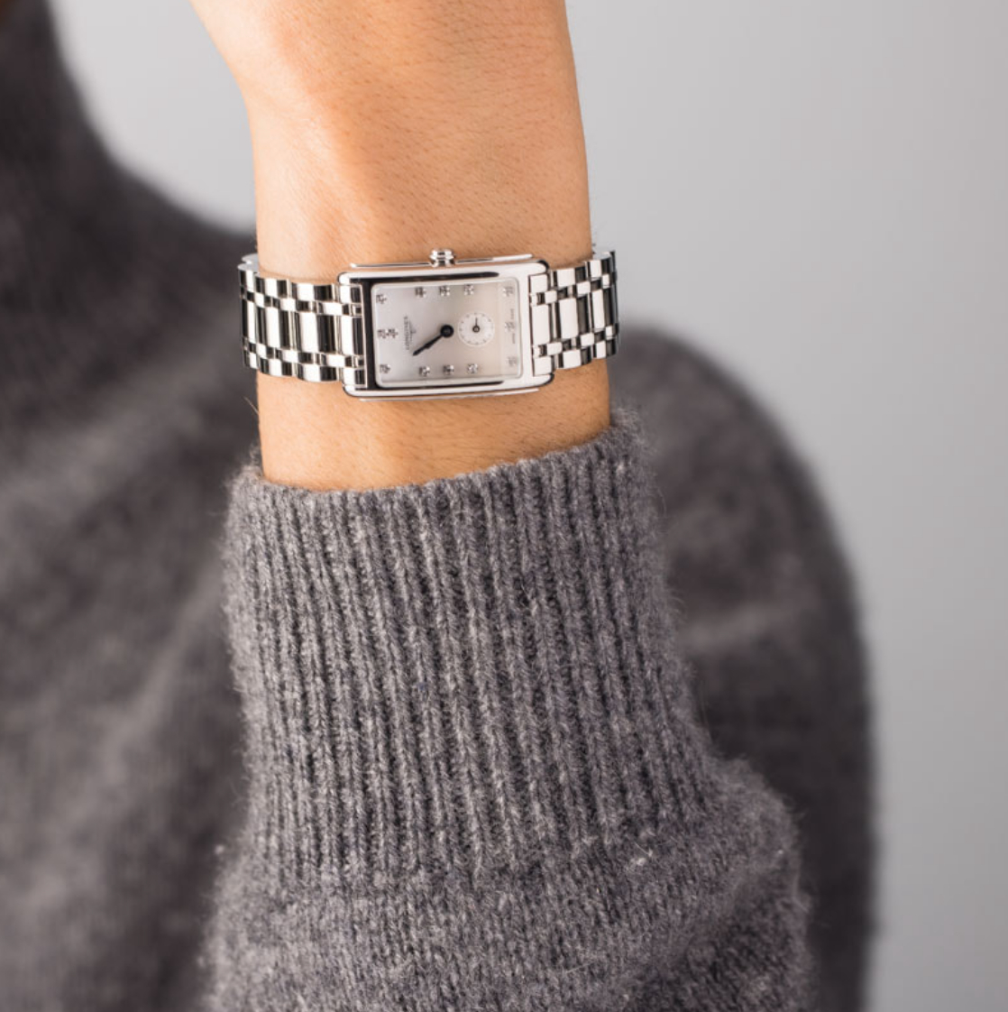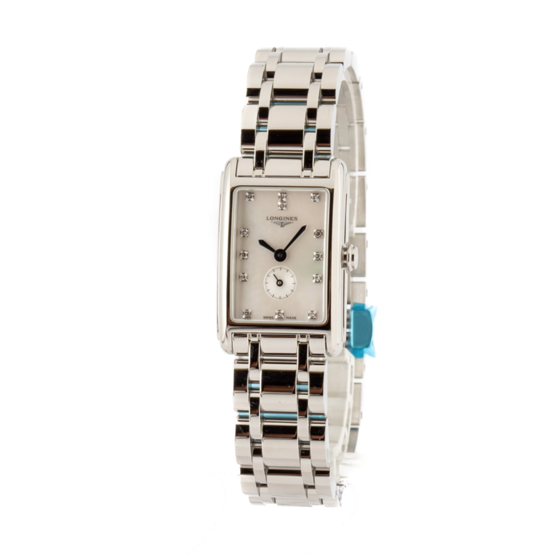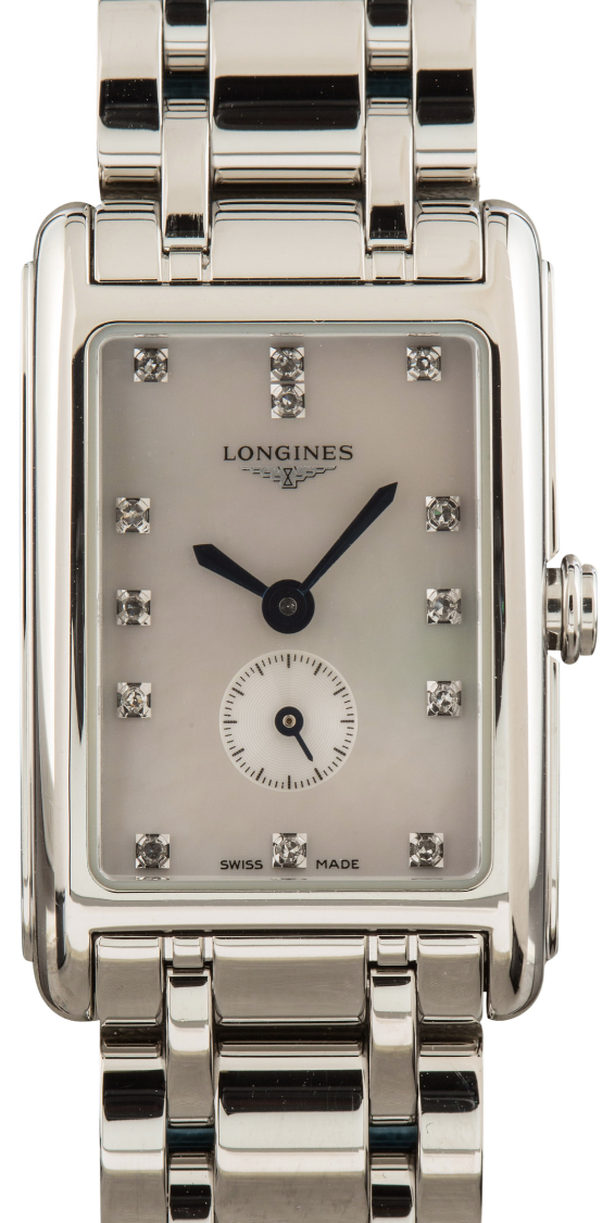 Pre-owned/unworn Longines DolceVita ref L5.255.4.87.6 is an affordable way to invest in a Swiss luxury watch adorned with diamonds. Features include an approachable 20.80 X 32.00 mm case, 6.9mm thickness, scratch-resistant sapphire crystal, caliber L178 quartz movement, and a durable stainless steel finish. This model displays the time on a shimmering white Mother-of-Pearl dial via blued steel hands and 13 Top Wesselton VS-SI diamonds – totaling 0.059 carats. It’s luxurious yet somewhat understated and still very wearable. We are confident you will enjoy wearing this diamond beauty for many more years to come. Make it yours today for a very competitive Longines price.