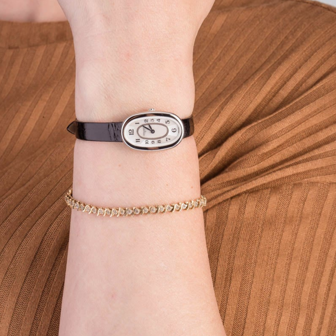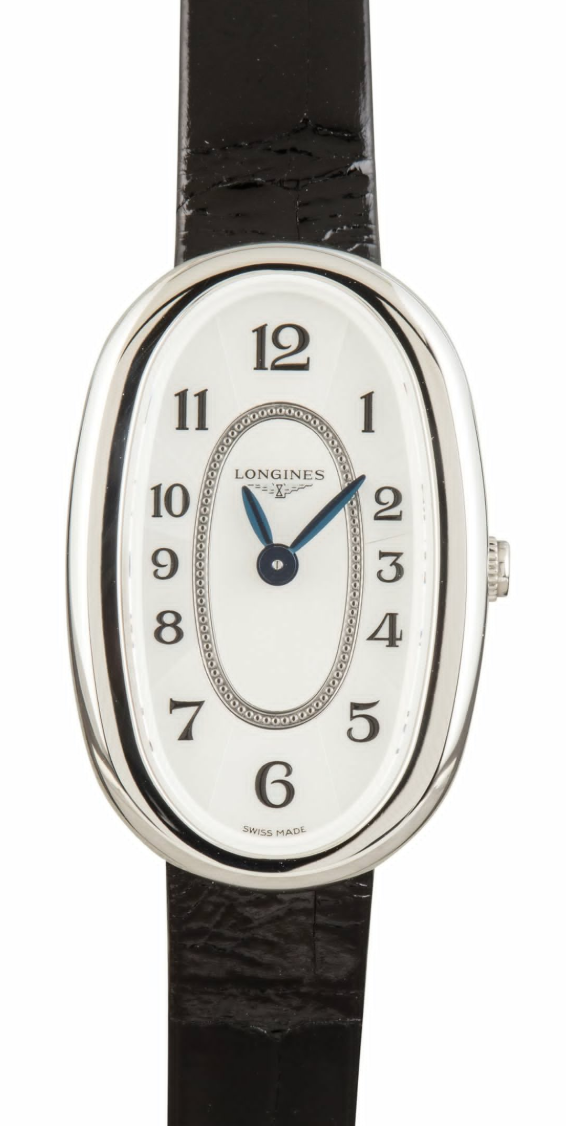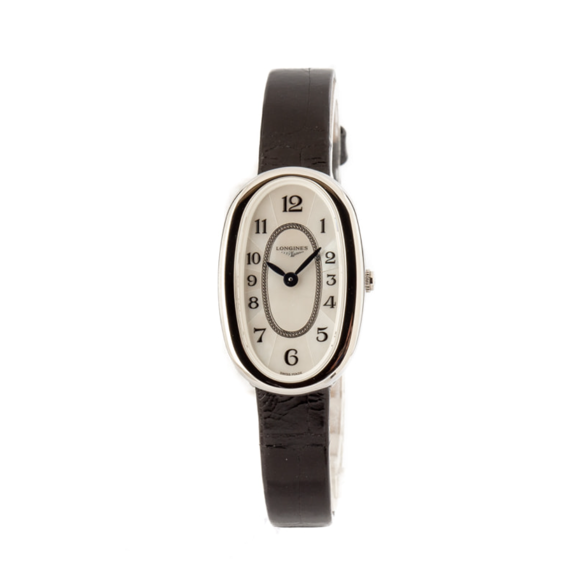 Pre-owned/unworn Longines Symphonette ref L2.305.4.83.0 carries on the brand’s tradition of celebrating the beauty of women with delicate and flattering lines and styles that transcend time and fashion. The long, oval case measures 5.85mm thick and 18.9mm x 29.4mm and will suit nearly any wrist. It is paired with a versatile leather strap on the used Longines for sale here. The case is presented in stainless steel and features a scratch-resistant sapphire crystal, pull crown, solid case back, and lovely Mother-of-Pearl dial decorated with black Breguet-style hour markers, blued steel hands, and a textured inner ring. The case is rated water resistant up to 30 meters and houses the L963 quartz movement – perfect for daily wear.