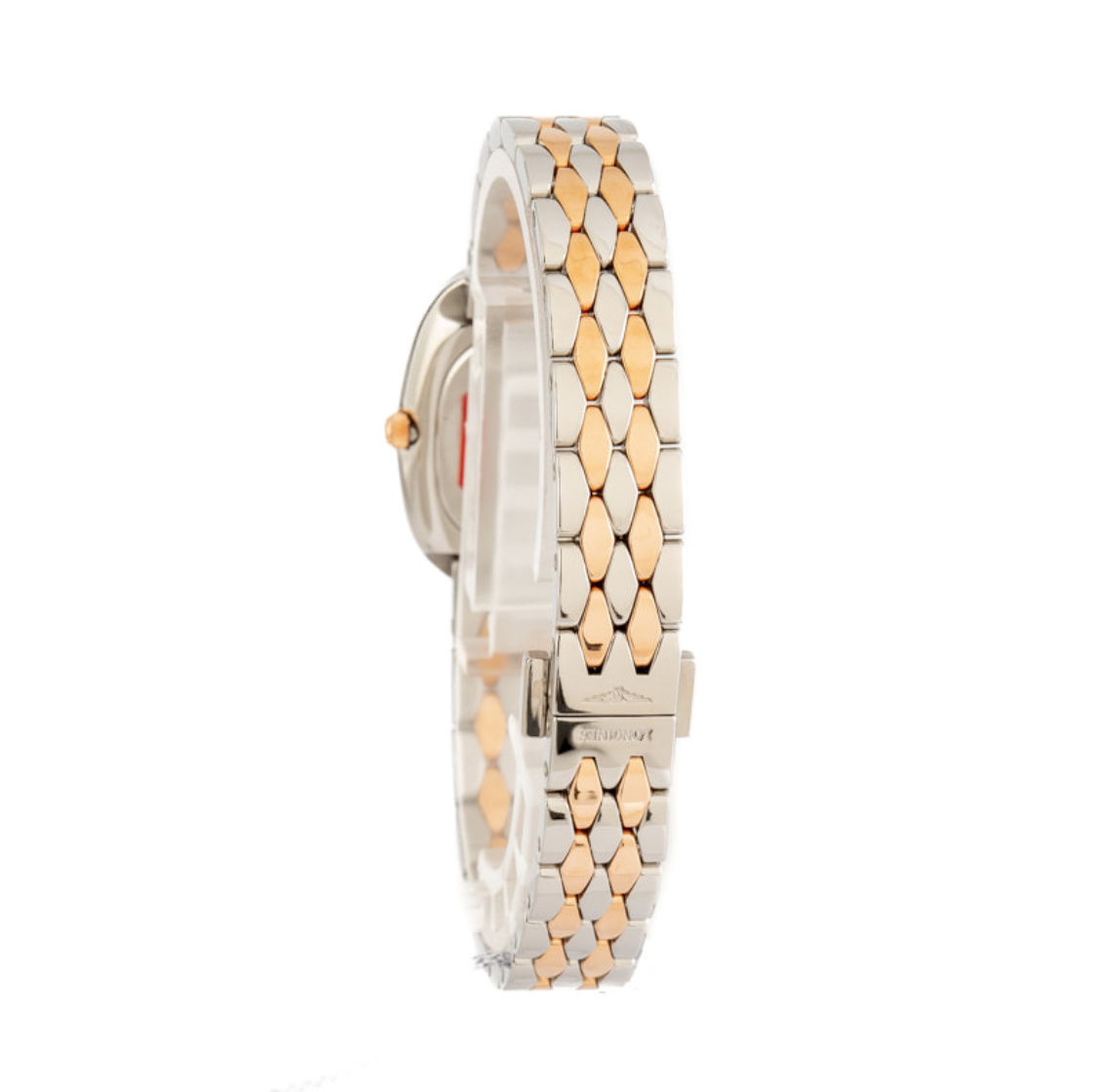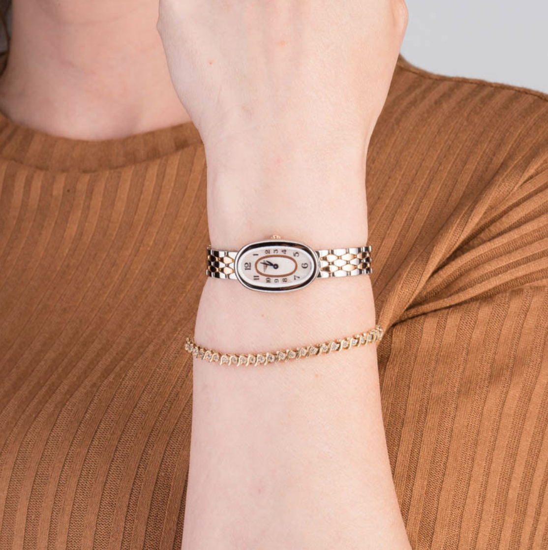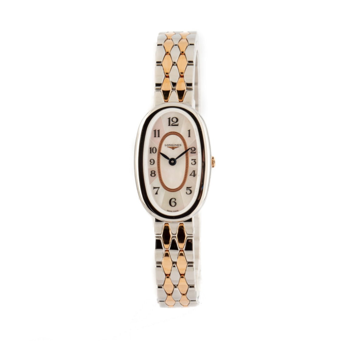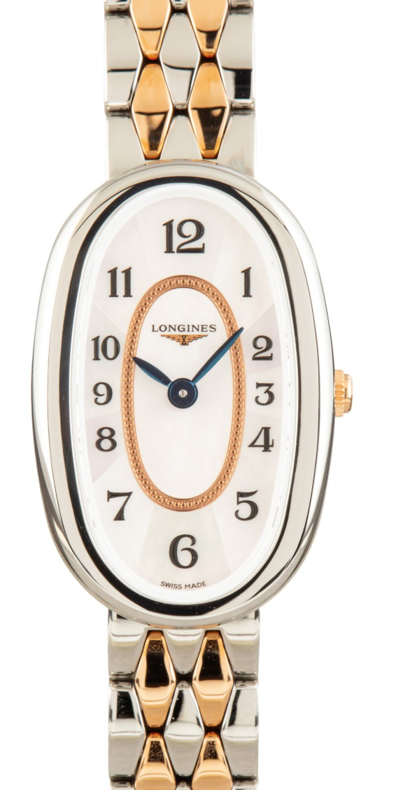 Pre-owned/unworn Longines Symphonette ref L2.305.5.83.7 is the classic, oval-shaped women’s watch with an exquisite two-tone steel and rose gold design set. It’s elegant, refined, and timeless – perfect for the woman with a sharp eye for high style. At the same time, this Longines celebrates the grace and elegance of a woman’s wrist by featuring a sleek, oval-shaped case with a delicate 5.85 profile and 18.9mm X 29.4mm dimensions and a silky, multi-link bracelet. The pull crown, center links, and center of the dial are decorated in plated rose gold, while the rest of the watch is made of durable stainless steel. Ref. L2.305.5.83.7 also features a scratch-resistant sapphire crystal and water resistance up to 30 meters, creating a watch you can wear and enjoy confidently as you go about your day.