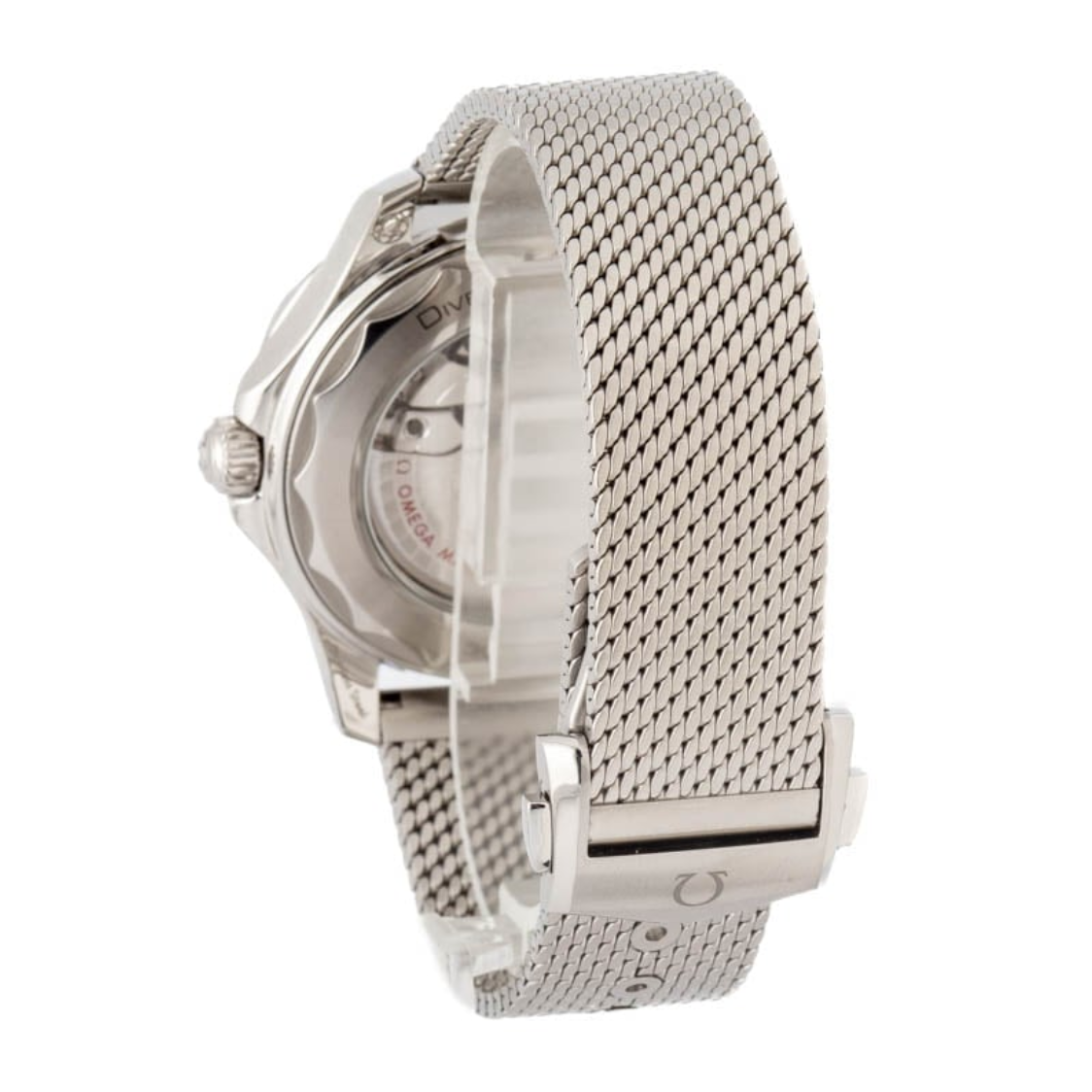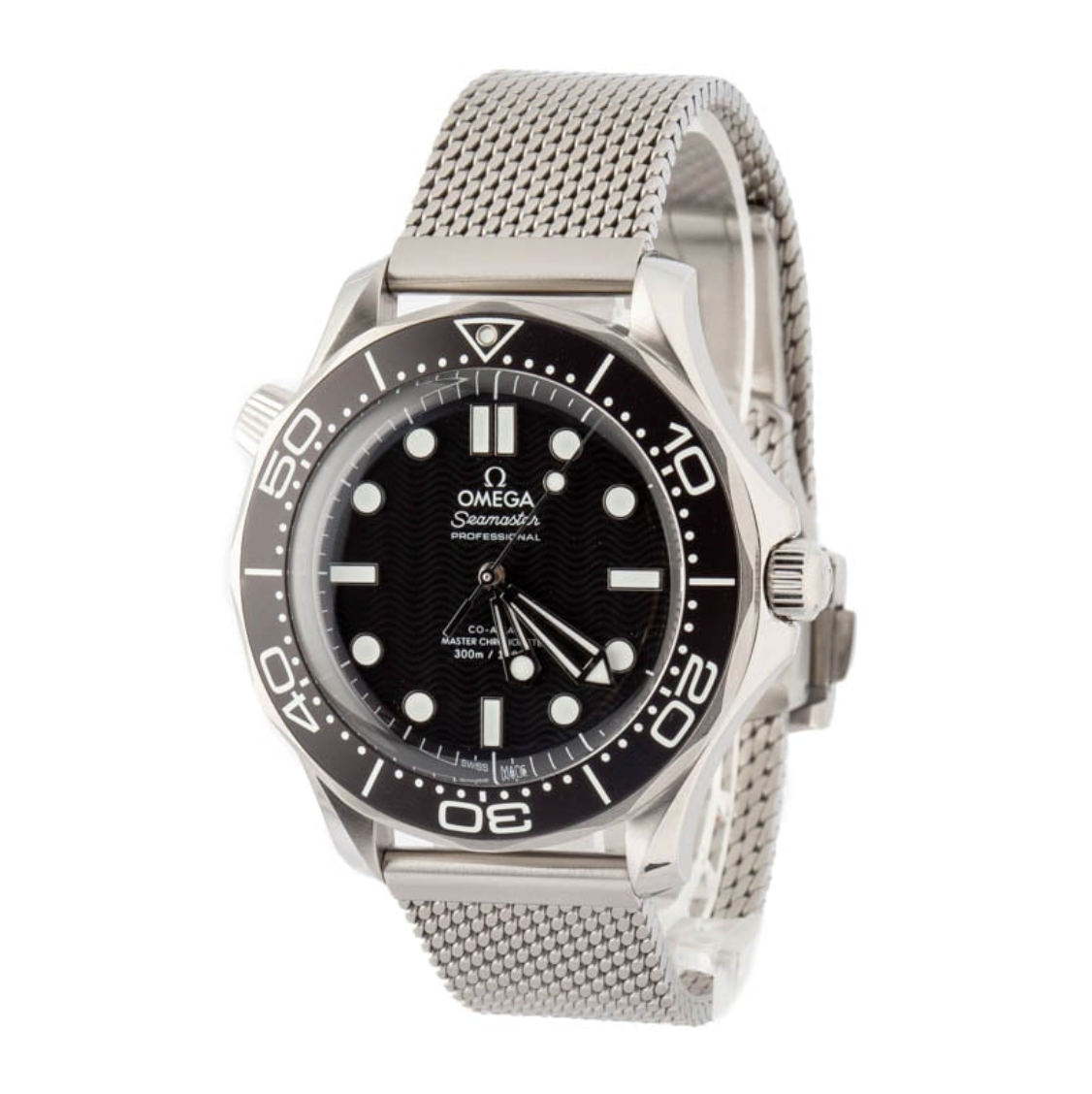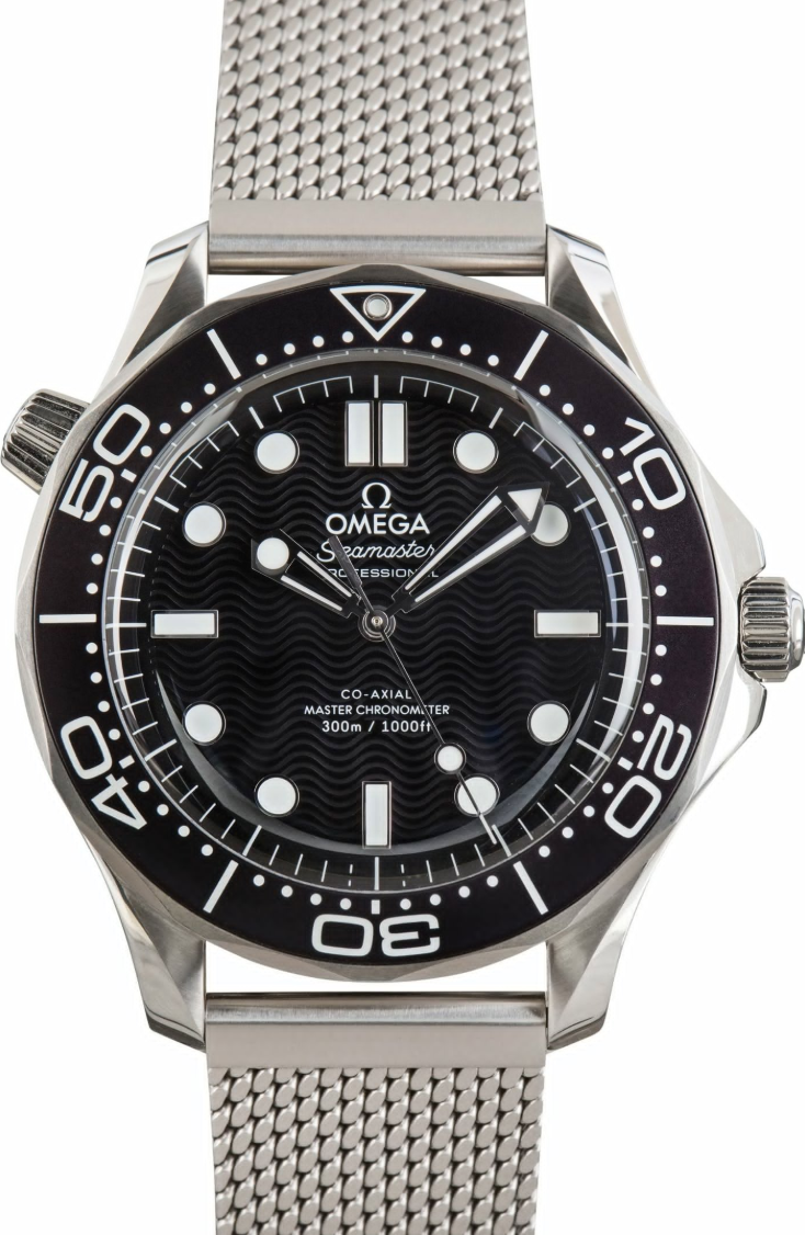 Pre-owned OMEGA Seamaster Diver 300M ref 210.30.42.20.01.010 (2025) debuted in 2024 as part of a highly anticipated duo of no-date Seamaster Diver 300M watches, which included a curious all-silver steel and titanium model and the Omega 210.30.42.20.01.010 for sale here in stainless steel and with a black dial and bezel. Both are available on the mesh-link bracelet, a first for a regular production model and, hopefully, nowhere near the last. Furthermore, at the heart of each model is the caliber 8806 self-winding Master Chronometer, which we can view through the exhibition-style case back. We expect the Omega 210.30.42.20.01.010 to be a top choice among collectors with its classic black and silver dive watch design codes. It sports a 42mm stainless steel case rated waterproof up to 300 meters, a black oxalic anodized aluminum bezel with a white Super-LumiNova diving scale, and a matching black aluminum dial with laser-engraved waves, rhodium-plated hands and hour markers, and more Super-LumiNova.