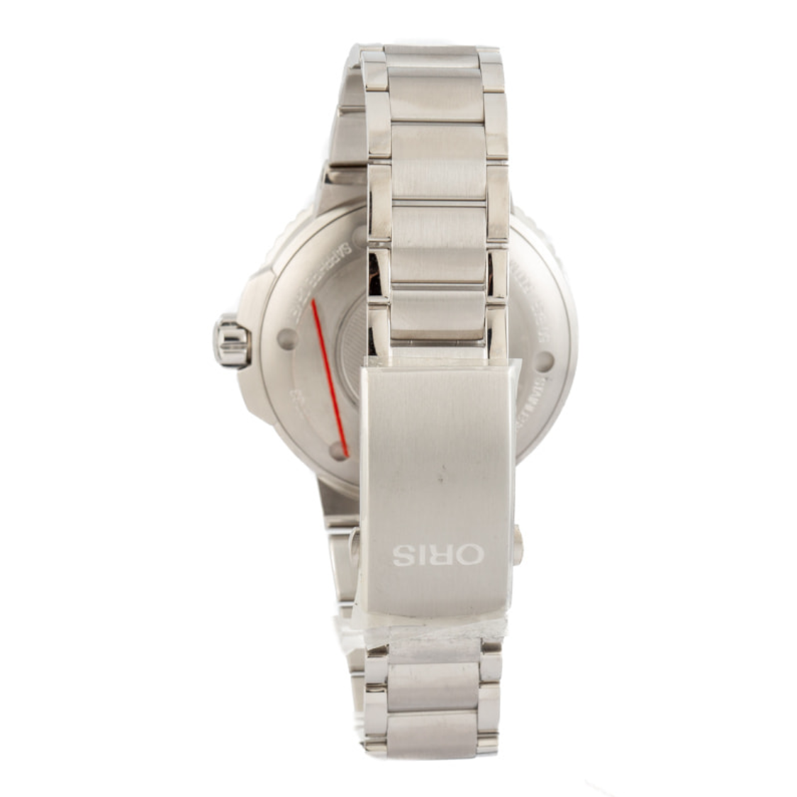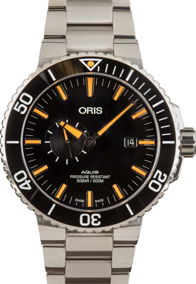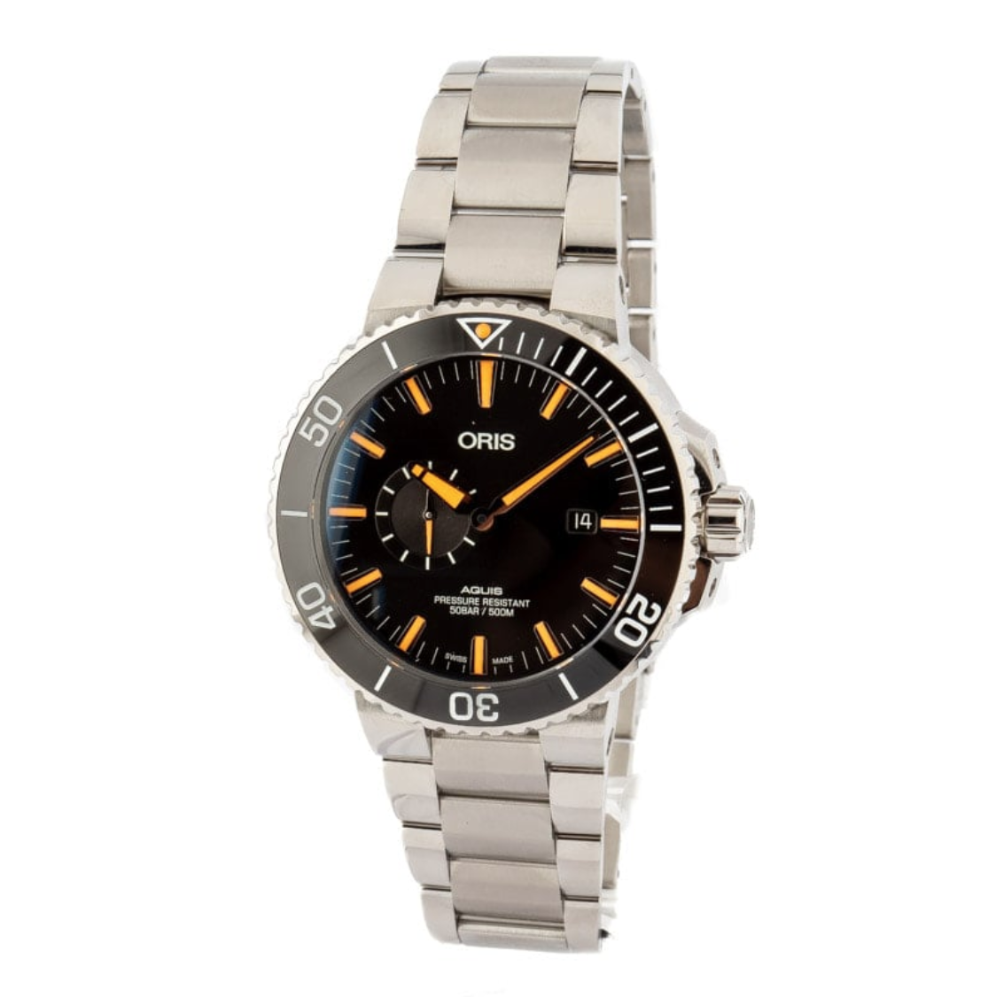 Pre-owned/unworn Oris Aquis Small Second, Date ref 01 743 7733 4159-07 8 24 05PEB. Are you interested in adding a pre-owned Swiss dive watch to your collection that won’t break the bank? Look no further than the Oris Aquis for sale here today. This impressive diver features everything collectors desire in an underwater companion, including a luminous display on the dial, a reliable movement, a safer uni-directional time-lapse bezel calibrated to 60-minutes, and a substantial level of water resistance. Reference 01 743 7733 4159-07 8 24 05PEB is a robust example, measuring just over 45mm in diameter. It makes a bold impression on both the wearer and all who gaze upon it with its stylish steel finish, black dial and bezel, and contrasting orange lume.