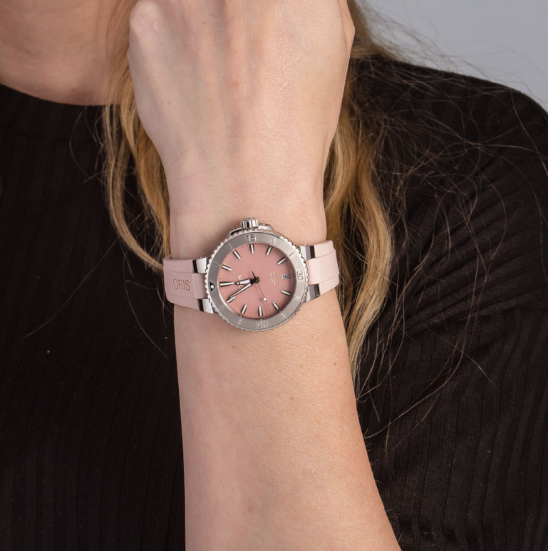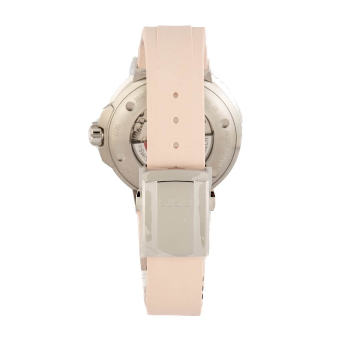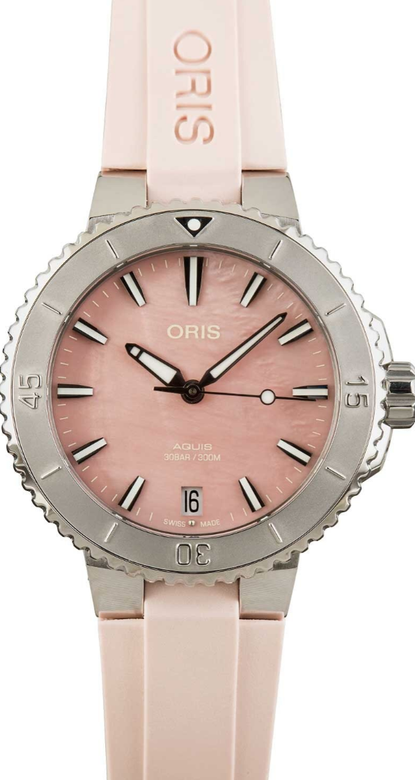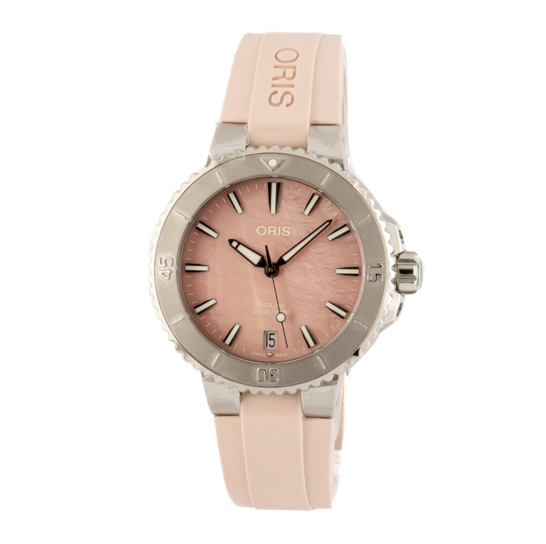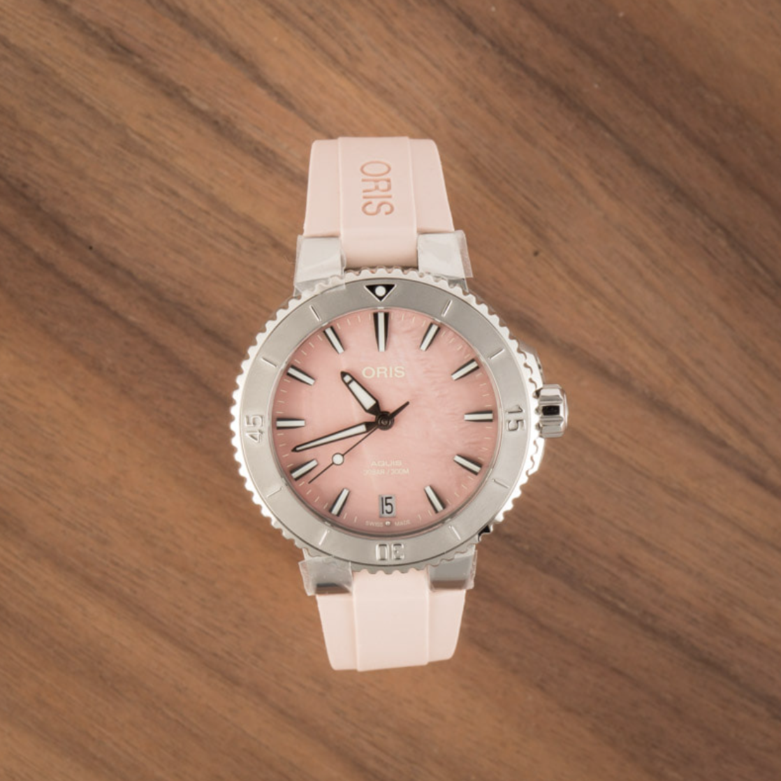 Pre-owned/unworn Oris Aquis ref 01 733 7770 4158-07 4 18 66FC is the same iconic dive watch that has lived in the Oris portfolio for years, but with a shimmery Mother-of-Pearl dial and matching rubber strap. The contrast of the silvery stainless steel finish against the soft pastel dial and bracelet is intriguing and feminine – perfect for the modern collector searching for a fashion-forward, Swiss-made watch. If you appreciate the unique aesthetic of a genuine dive watch, this women’s Oris might be the perfect timepiece for your wrist. Features include substantial water resistance, a uni-directional 60+-minute bezel, and a dial decorated with Super-LumiNova hour markers and hands.