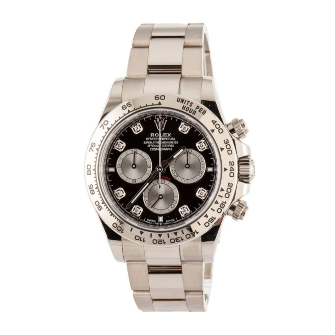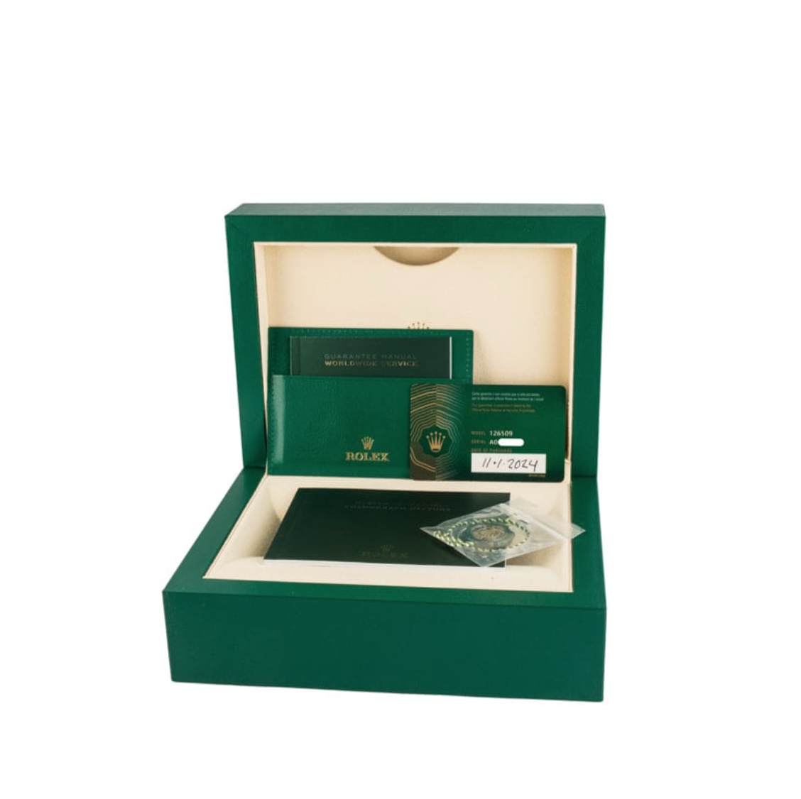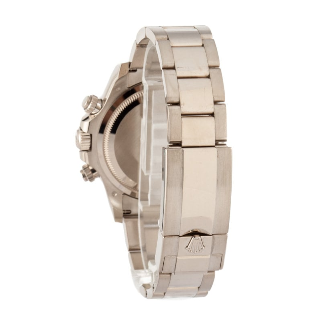 Pre-owned Rolex Daytona ref 126509 (2024) hails from the collection released in 2023, which most notably introduced us to a brand new movement for the iconic chronograph – the caliber 4131. For those unfamiliar, Rolex didn’t bring production of the Daytona movement in-house until 2000 with the caliber 4130. That movement remained the brand’s go-to Daytona engine until last year when ref. 4131 took its place, featuring fewer components and a beautiful Rolex Côtes de Genève decoration. The white gold model, with its lustrous precious metal finish, is the definition of stealth wealth. It displays the time on a bright black dial via 18k white gold applied hour markers fixed with diamond brilliants, matching white gold hands filled with long-lasting Chromalight, and steel chronograph sub-dials. A scratch-resistant sapphire crystal and a Triplock waterproof screw-down crown ensure a lifetime of reliable timekeeping.
