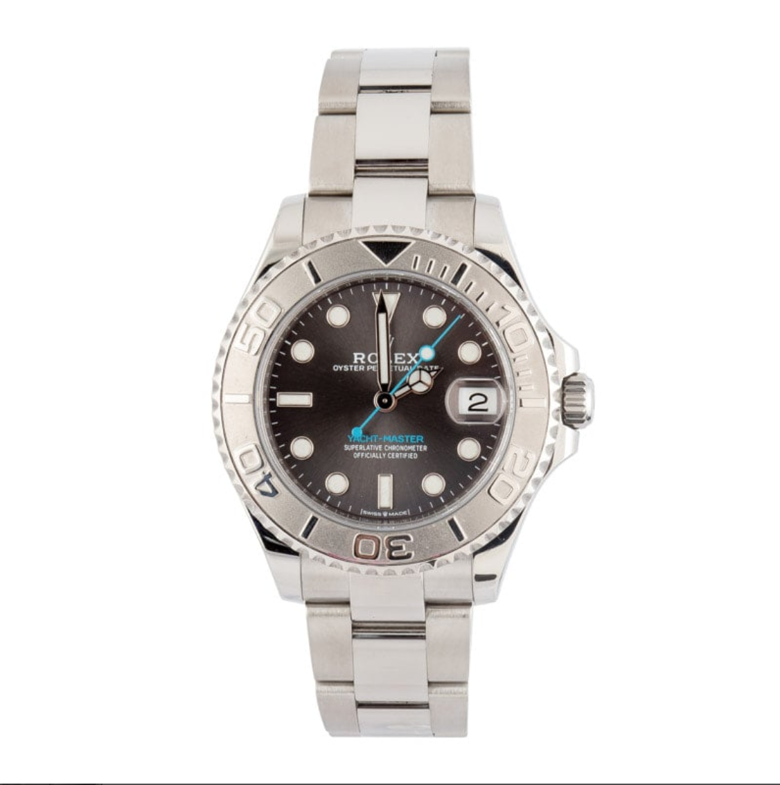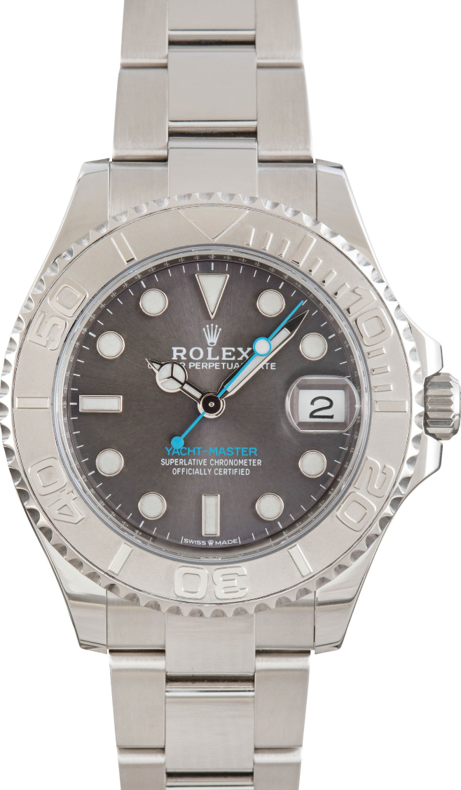 Pre-owned Rolex Yacht-Master 37 ref 268622 (2016 – 2025) delivers all the signature YM luxury in a more compact, mid-size 37mm case perfect for smaller wrists or anyone who prefers a sleeker profile without sacrificing presence. Crafted from stainless steel and fitted with a solid platinum timing bezel, this model brings just the right balance of sporty utility and upscale refinement. The sunburst slate dial shifts beautifully in changing light, accented by aqua blue text and long-lasting Chromalight hands and markers for crisp legibility. Like its larger siblings, it’s powered by an automatic movement and rated to 100 meters of water resistance, making it as capable as it is stylish. The 268622 is a versatile alternative to the Submariner, with softer lines, a more polished look, and that unmistakable Yacht-Master wrist feel.