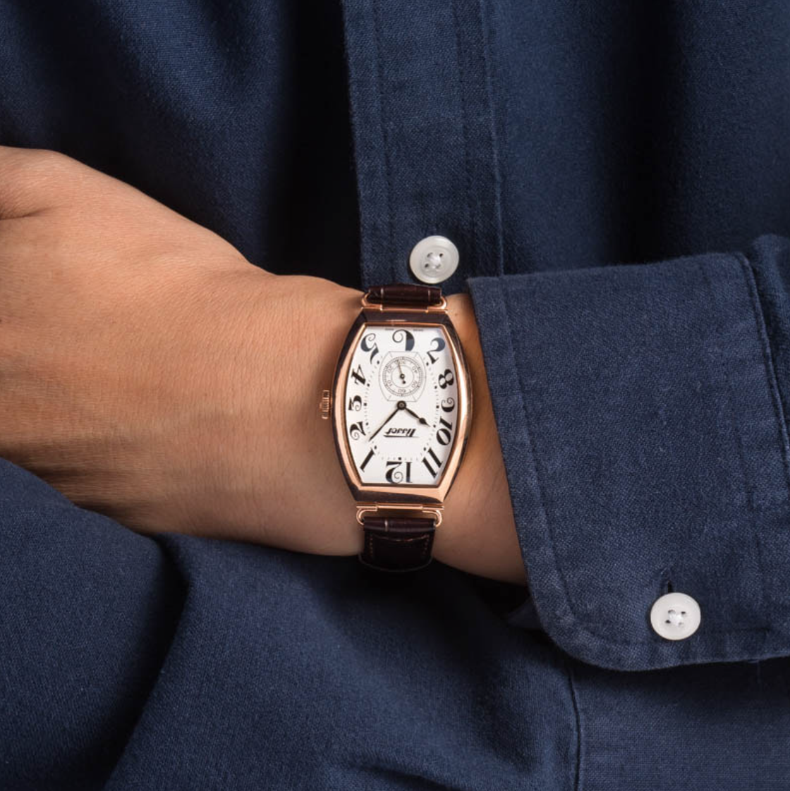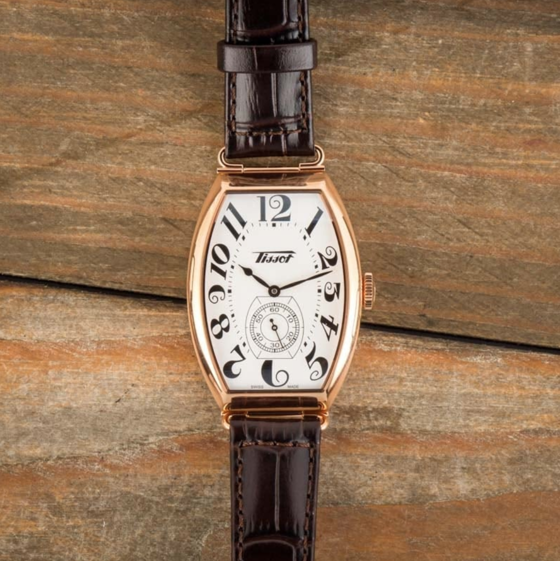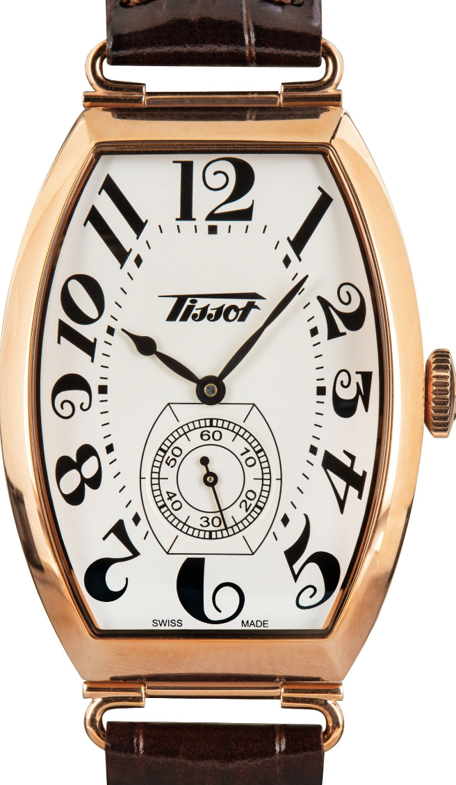 Pre-owned/unworn Tissot Heritage Porto Mechanical ref T128.505.36.012.00, with its striking tonneau-shaped case, captures the essence of a watch from the 1910s. Tissot produced a few different variations, including the rose gold PVD-coated model for sale here. Features include a sophisticated leather strap with a butterfly clasp, a classy white dial decorated with Breguet-style hour markers, domed and scratch-resistant sapphire crystal, and a Swiss mechanical movement with a 42-hour power reserve. This remarkable Tissot will look outstanding on a broad range of wrists, measuring 31.1mm by 10.5mm thick. It sports a lovely domed profile and stylized design elements on the dial.