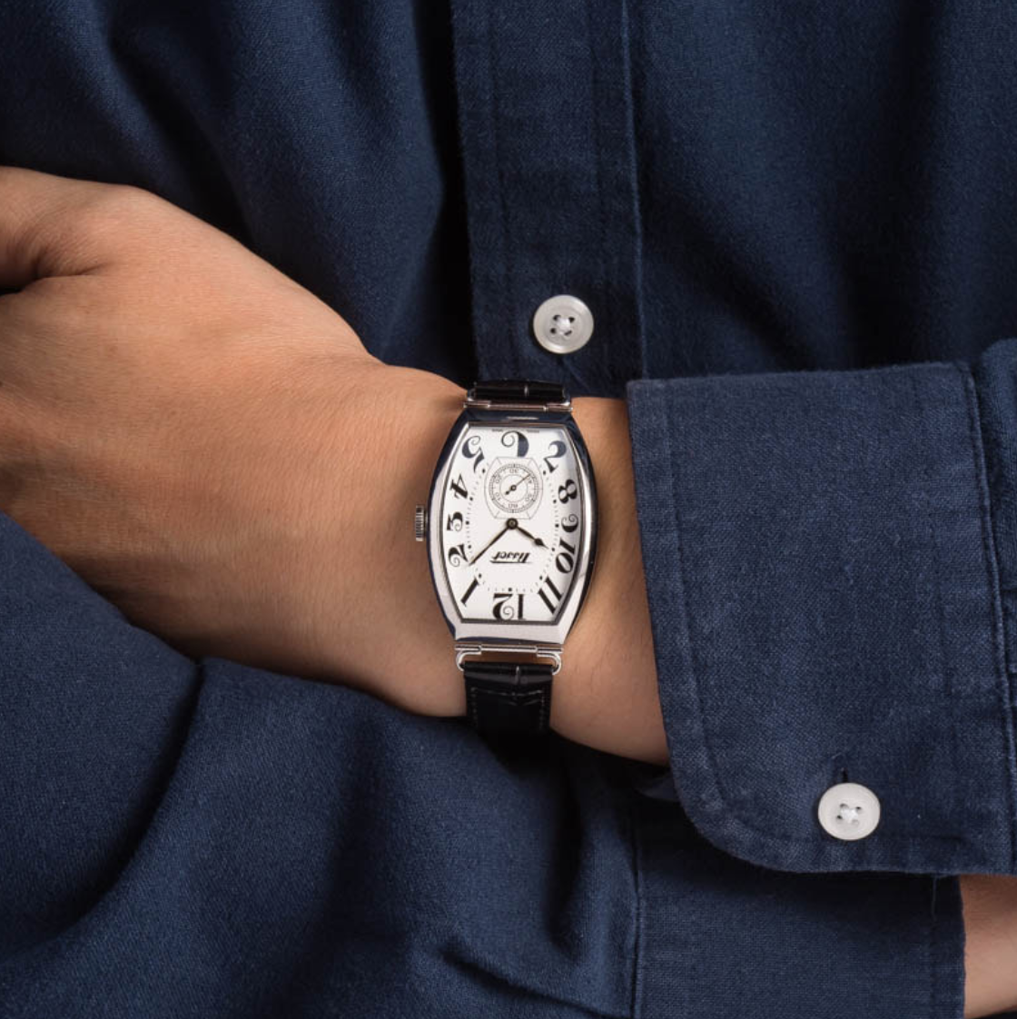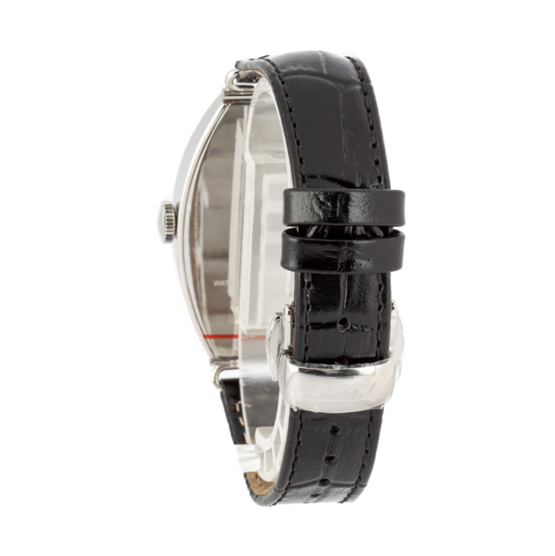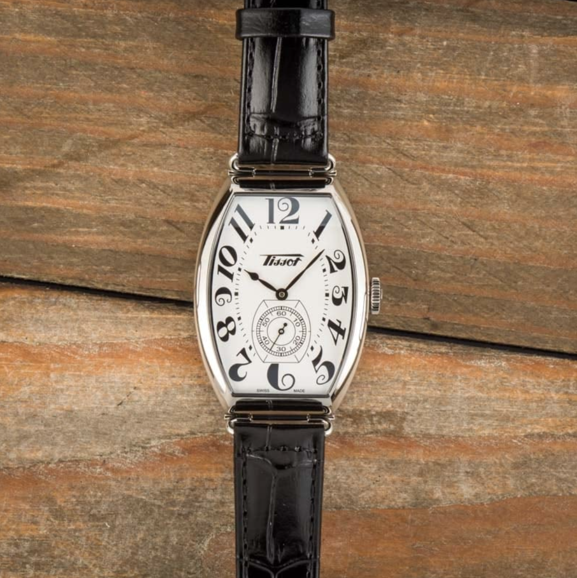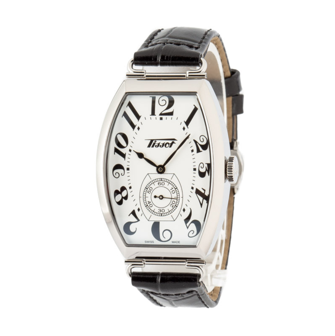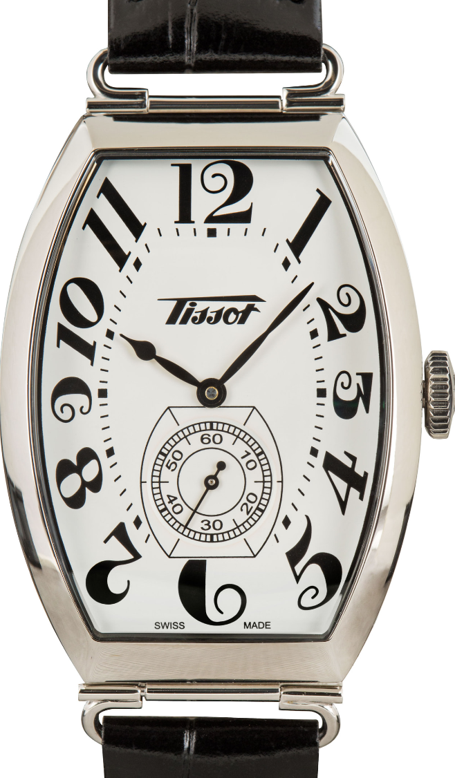 Pre-owned/unworn Tissot Heritage Porto Mechanical ref T128.505.16.012.00 is a heritage collection watch inspired by a timepiece from the 1910s. It has a striking tonneau-shaped case with a domed profile and a dial decorated with swirling Breguet-style hour markers. The case is dressed in versatile 316L stainless steel and features a domed sapphire crystal with AR coating, a 31.1mm measurement, and 10.5mm thickness. The Alligator-style grained cowhide leather strap features a butterfly clasp and attaches to the case with striking wire lugs. This vintage-inspired Tissot also sports a reliable Swiss mechanical movement with a convenient 42-hour power reserve.