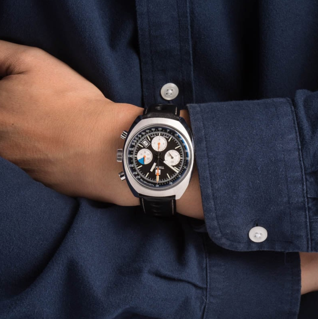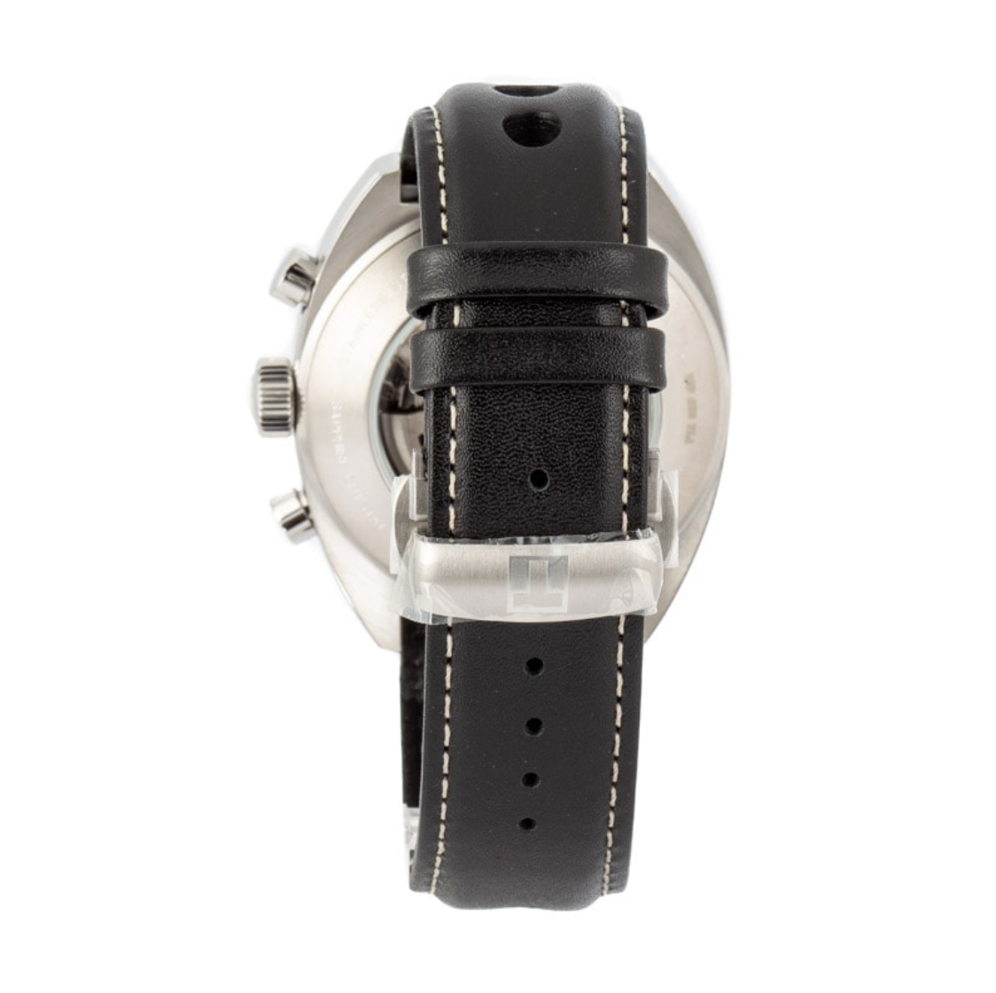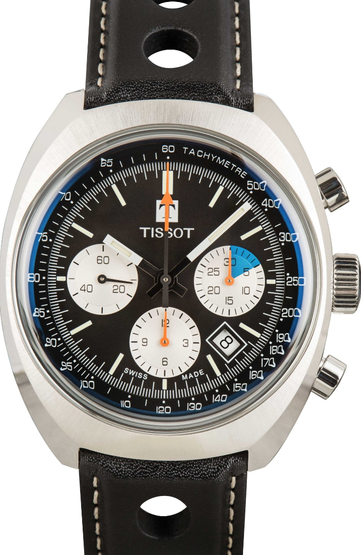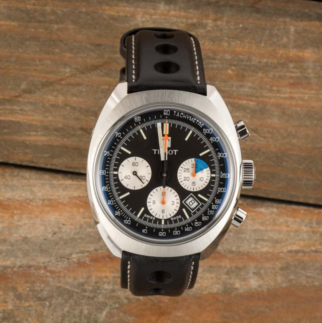 Pre-owned/unworn Tissot Heritage 1973 ref T124.427.16.051.00 evokes the essence of a bygone era, specifically 1973 and the vintage Navigator Chronograph. It pays homage to the brand’s motorsport roots and one of its strongest partnerships, the Kessel Classics racing team, forged in the 1970s and re-established just a few years ago, in 2018. The watch is a limited edition Tissot, produced in quantities of just 1,973 pieces, and we have a remarkable black reverse panda dial model for sale here today in UNWORN condition. Features include a traditional tri-compax dial with a distinctive blue 5-minute countdown in the minutes sub-dial, a 43mm tonneau-shaped case in stainless steel, a domed AR sapphire crystal, and the ETA Valjoux 7753 self-winding movement. The leather strap, with its oversized perforations, is a reproduction of a strap patented by Tissot in the 1960s and inspired by the pilot’s steering wheels from that era.